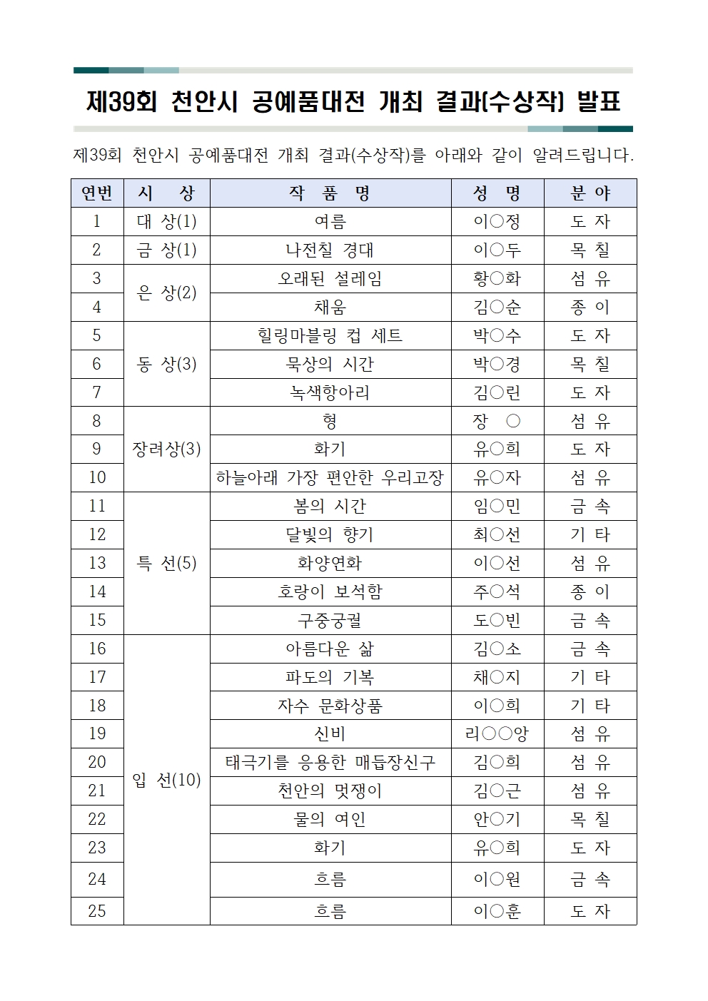 | 2023년 제29회공주시공예품경진대회 수상자발표 (0) | 2023.06.12 |