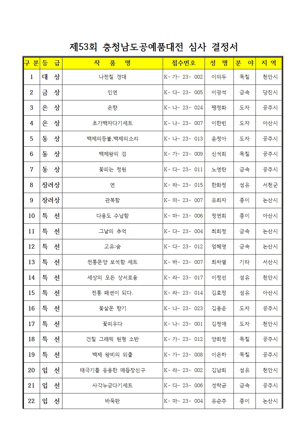 2023년 제53회충청남도공예품대전 수상자 발표