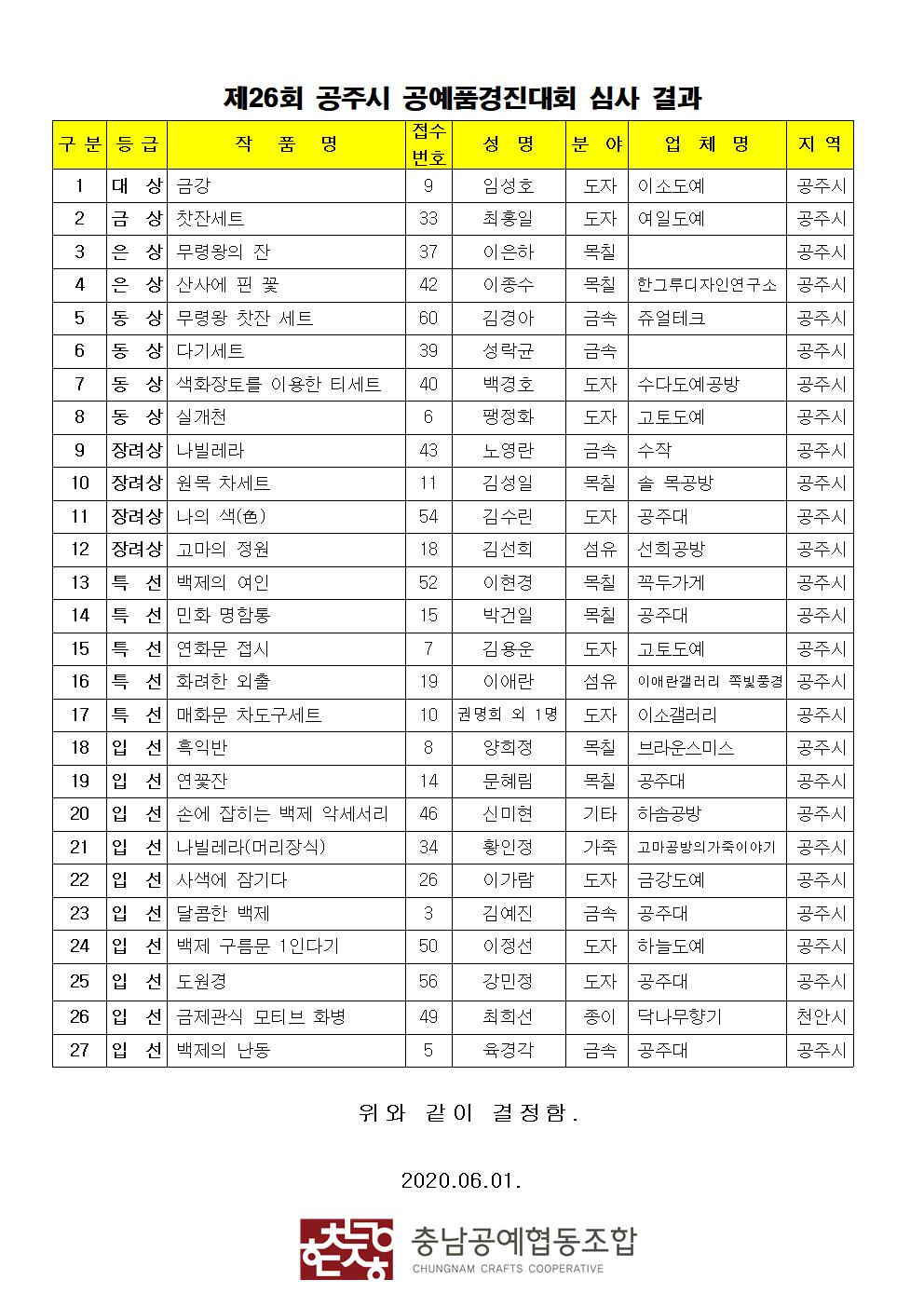| 제 50회 충청남도 공예품대전 심사 결과 (0) | 2020.06.06 |