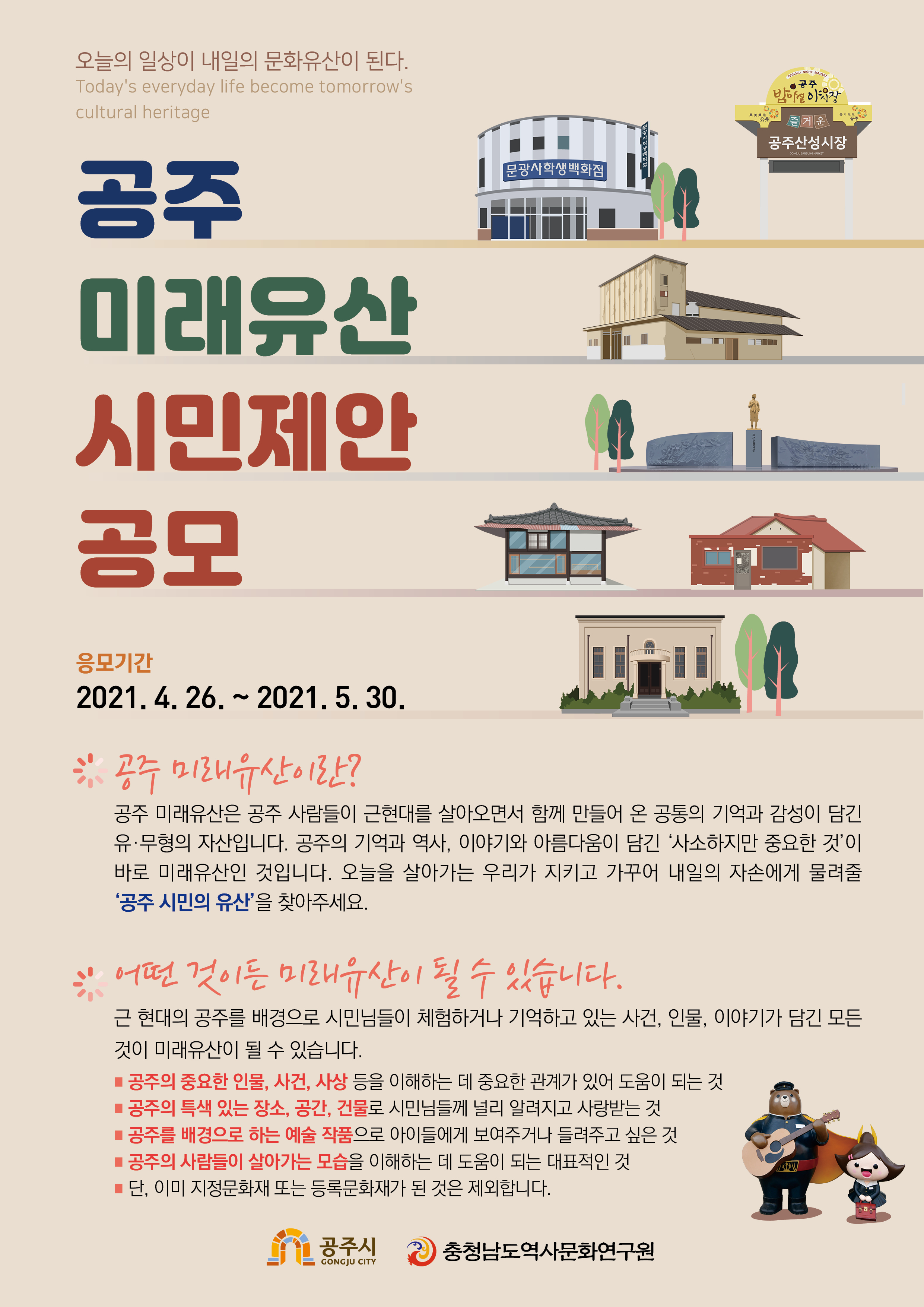 오늘을 살아가는 우리가 지키고 가꾸어 내일의 자손에게 물려줄 ‘공주 시민의 유산’을 찾아주세요.