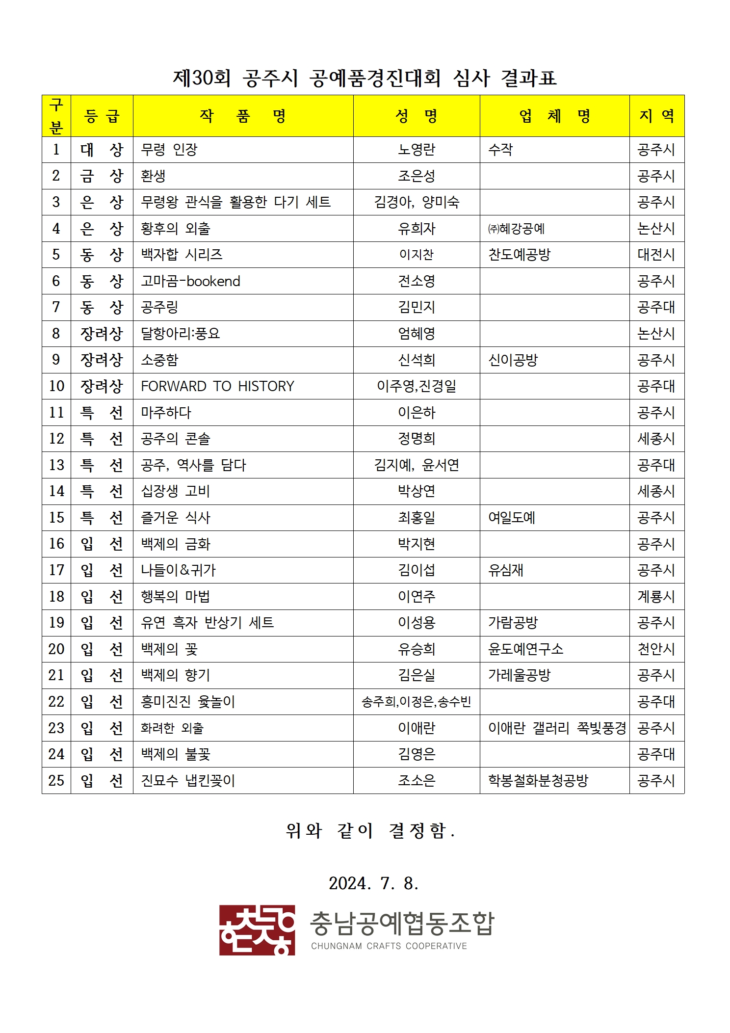 2024년 제30회 공주시공예품경진대회 결과안내