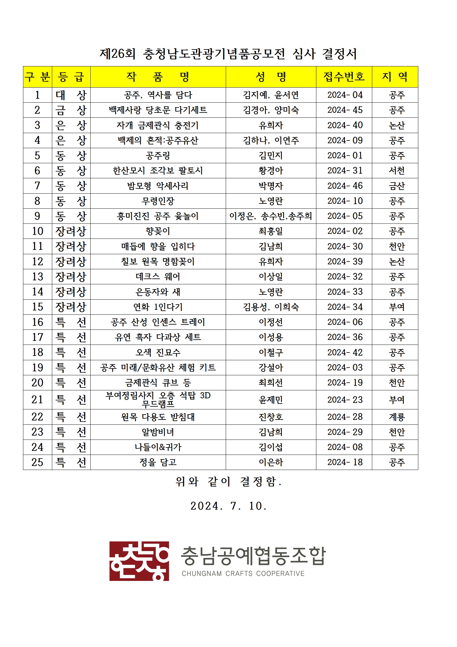 2024년 제26회 충청남도관광기념품공모전 결과안내