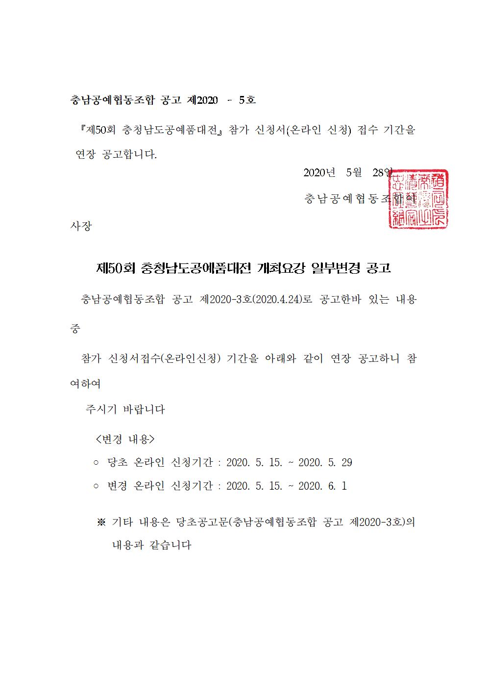 제50회 충청남도 공예품대전 참가신청서(온라인) 접수 기간을 연장 공고 합니다.